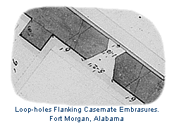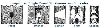 This made it necessary to move loop-hole apertures backward away from the exterior side of the wall and closer to the position where a defender would stand to fire through the loop-hole so that muskets' muzzles could be projected out of the aperture without greatly inconveniencing troops defending loop-holes. But it was still necessary to maintain an effective lateral field of fire so that a defender firing through a hole-hole could point his piece from side to side without interference. These two objects were best accomplished by giving loop-holes an hour-glass form, in plan, similar to that used for embrasures designed for cannon. Loop-holes for walls over 3 feet thick were splayed both toward the exterior of the wall and toward the interior; the aperture itself was reduced to the minimum dimensions possible to maintain the greatest amount of cover for troops firing through loop-holes. |